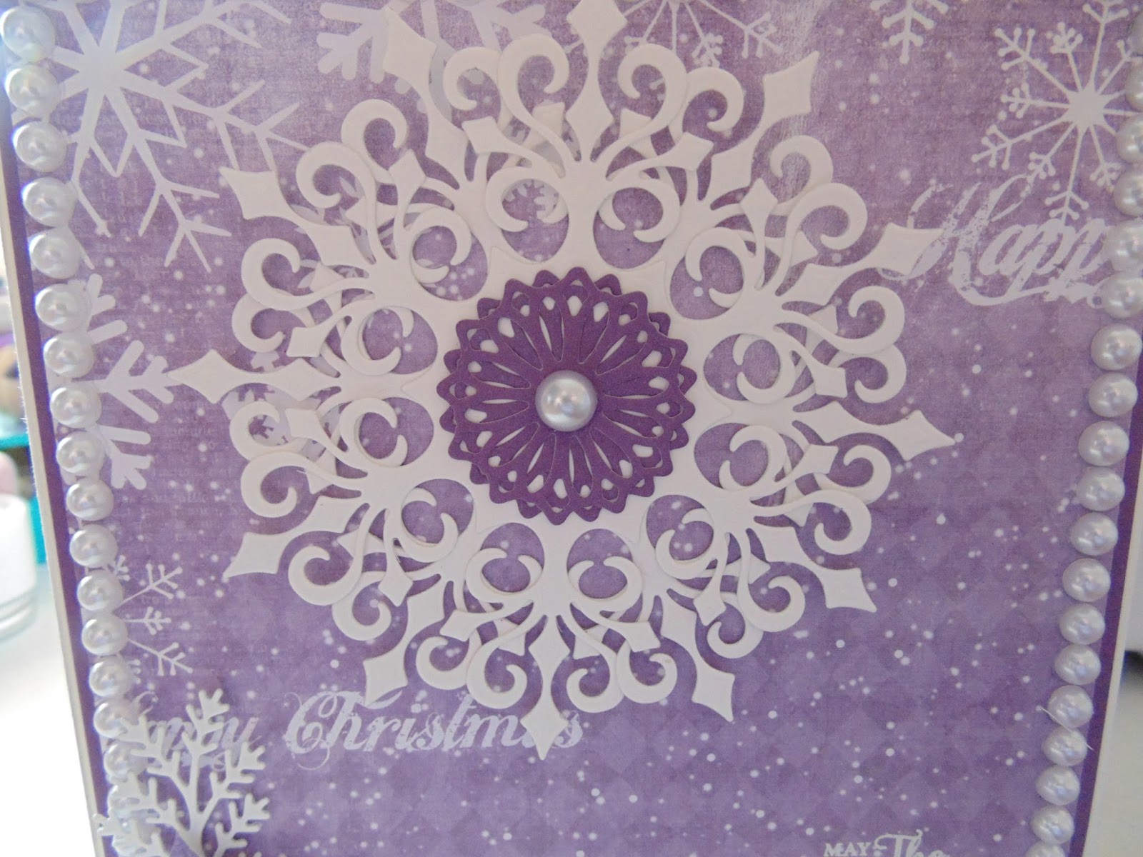 I cut the large snowflake die from the Justrite Snowflake and Tags Die Set out of Coconut White Card twice. I cut the inner die from the same set out of the plain side of one of the papers twice and added an 8mm White Pearl to the centre.
